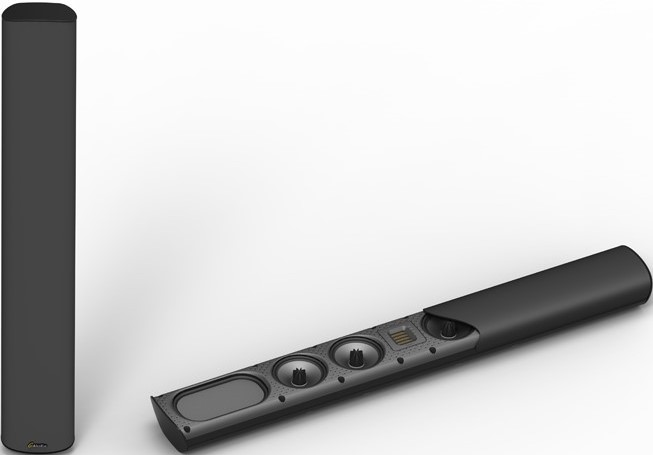 The sleek, attractively sculpted cabinet follows the same design philosophy that won the SuperSat 50 the highly respected Resi Award as the industry’s best looking on-wall loudspeaker. It is constructed from aerospace-grade aluminum and finished in gorgeous piano-gloss black. It contains four GoldenEar engineered 4.5" cast spiderleg-basket bass/midrange drivers with Multi-Vaned Phase-Plugs (MVPP) configured in a two-stage D’Appolito Array surrounding our signature High-Velocity Folded Ribbon high-frequency radiator. Two 4" x 7" quadratic planar low frequency radiators complete the driver complement, perfectly loading the bass/midrange drivers for open, boxless midrange and extended low-frequency response.