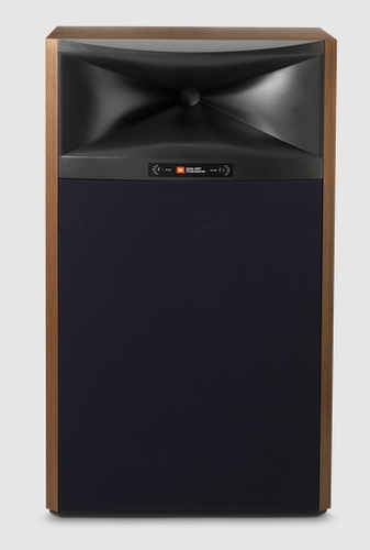 Iconic vintage JBL Studio Monitor design with exposed horn and blue baffle.