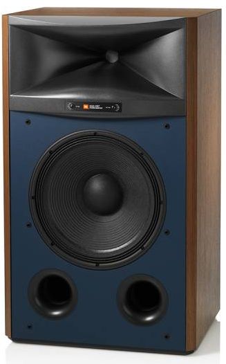 Iconic vintage JBL Studio Monitor design with exposed horn and blue baffle.